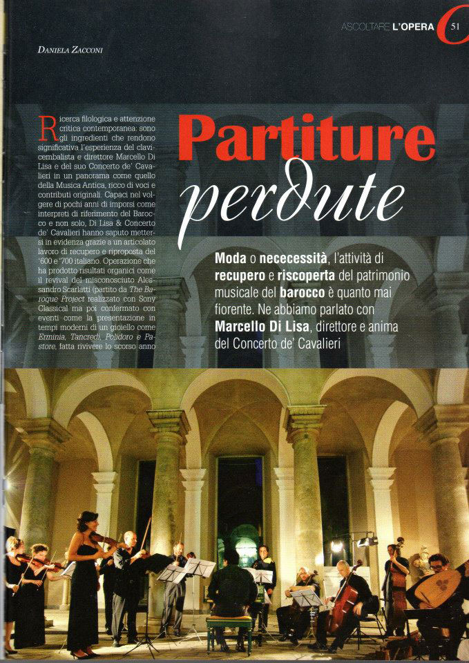 Ricerca filologica e attenzione critica contemporanea: sono gli ingredienti che rendono significativa l'esperienza del clavicembalista e direttore Marcello Di Lisa e del suo Concerto de' Cavalieri in un panorama come quello della Musica Antica, ricco di voci e contributi originali. Capaci nel volgere di pochi anni di imporsi come interpreti di riferimento del Barocco e non solo, Di Lisa & Concerto de' Cavalieri hanno saputo mettersi in evidenza grazie a un articolato lavoro di recupero e riproposta del '600 e 700 italiano. Operazione che ha prodotto risultati organici come il revival del misconosciuto Alessandro Scarlatti (partito da The Baroque Project realizzato con Sony Classical ma poi confermato con eventi come la presentazione in tempi moderni di un gioiello come Erminia, Tancredi, Polidoro e Pastore, fatta rivivere lo scorso anno dopo quasi tre secoli) o eventi come l’inedito Tito Manlio di Vivaldi che la formazione ha proposto a settembre nel prestigioso Festival barocco di Ambronay per poi portarlo in tour in Europa.